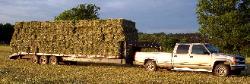 | The square bales are neatly picked up with a special grapple fork attachment and placed on wagons to be hauled into the sheds, or on trailers (ours or yours) for delivery. |