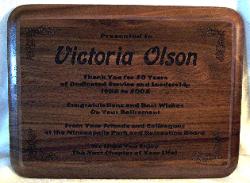 | Walnut Rounded Edge Plaque Horizontal or Vertical 9 x 12 inch PW912 (Horizontal - Shown) Price: $49.95 8 x 10 inch PW810 Price: $39.95 7 x 9 inch PW79 Price: $34.95 |