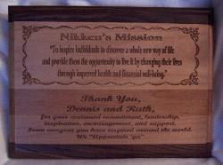| Especially for your special events and recognition we offer Engraved Walnut and Alder/Walnut Trimmed Wooden Plaques. Here at Treasured Haven Farm we engrave directly into the solid wood, we do not use golden plates or metal sheets. The beautiful walnut plaques have engraving enhanced with color-fill for an even more intense richness. |