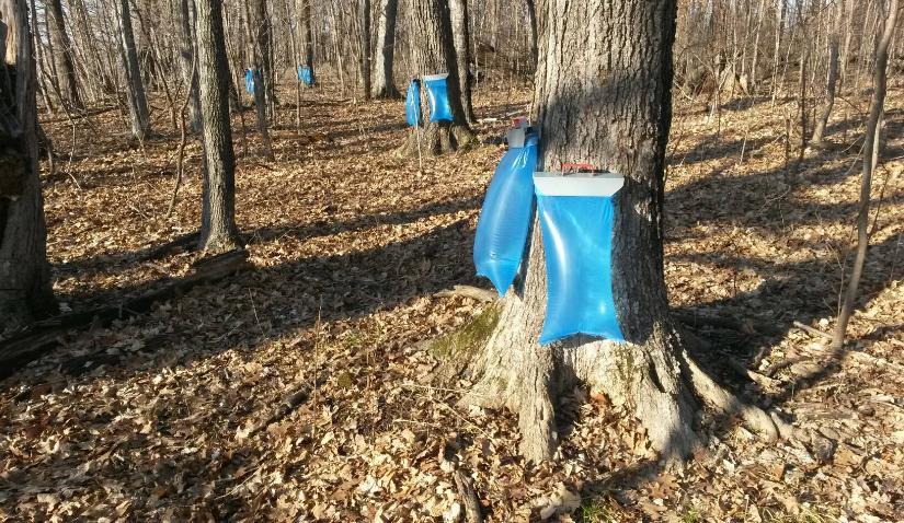 trees with the bags hung to collect the dripping sap.